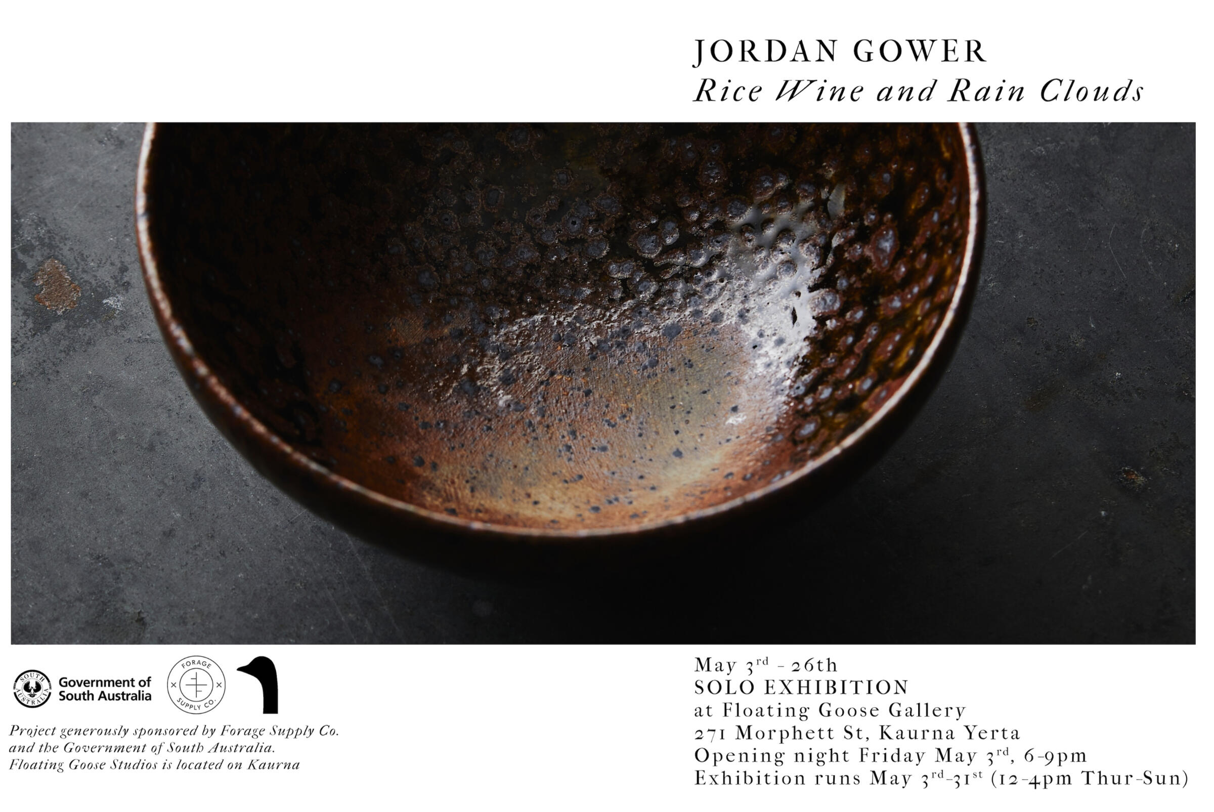 Rice Wine and Rain Clouds is Jordan Gower’s first solo exhibition of ceramics.With a focus on wheel throwing, Gower’s ceramic practice reflects a worldview that places importance on material and process. His forms explore clay and glaze chemistry in a style broadly influenced by European studio pottery, Chinese Song Dynasty wares and Japanese naturalism - highlighting craft objects as viable and meaningful contemporary expressions.The title Rice Wine and Rain Clouds may conjure images of nature and observation, of taking time to notice and meditating on our place within the world. However, for Gower these objects, although being made of nature, inherently reflect the city. They take on the character of their surrounding conditions, where space, surface and line intersect as passing views in time.Gower’s work often includes bowls as a motif; a vessel form with an expression that emphasises negative space, where emptiness becomes as tangible as a physical object. This recurring motif guides the material exploration, grounding his practice, yet in no way limiting the possible outcomes.Ultimately the exhibition aims to present objects that encourage us to pay careful attention, ceramics that hold still our attention and suspend our sense of material consumption as we move throughout a world of apparent limitlessness